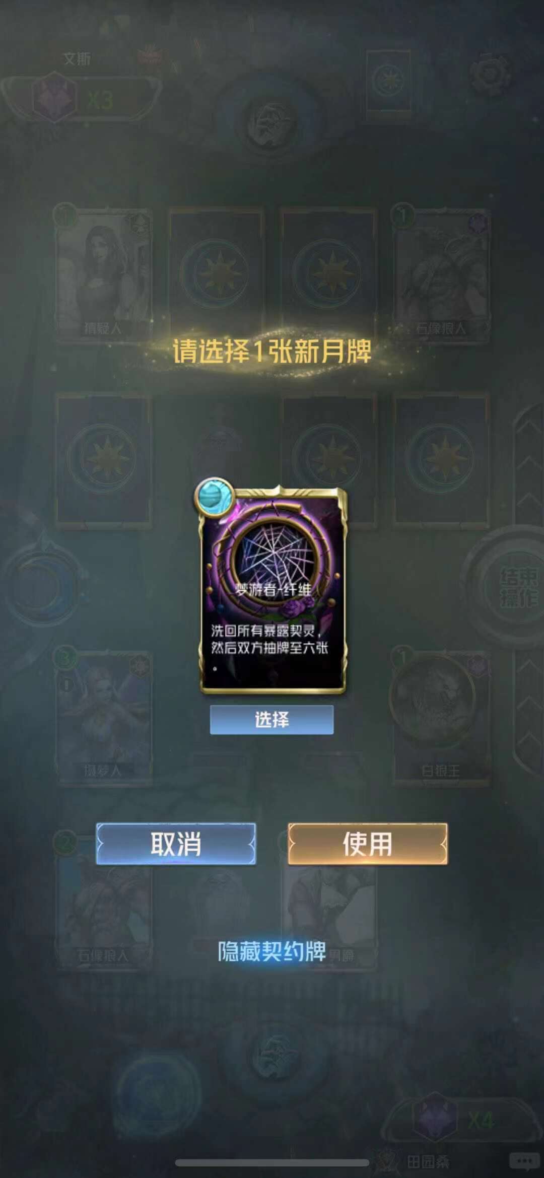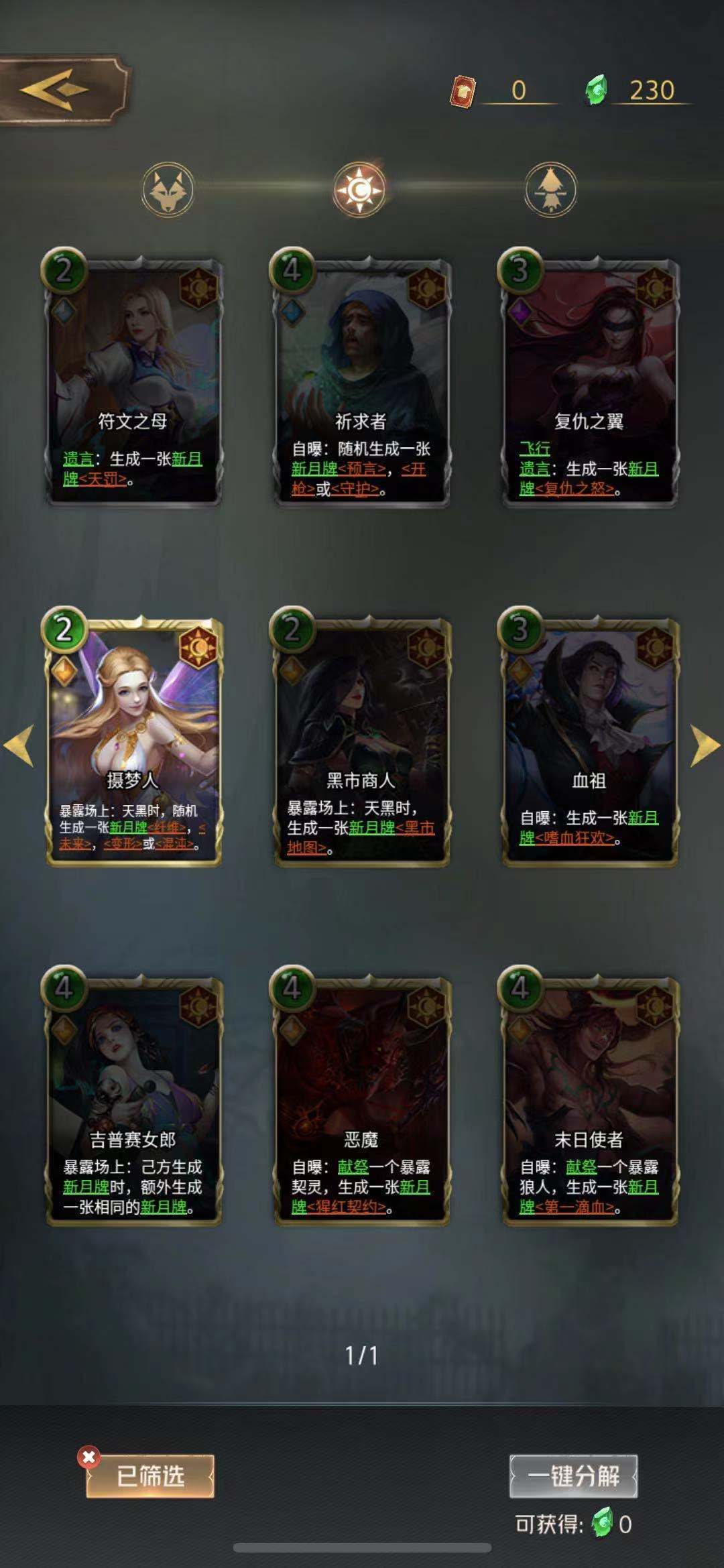 这些卡牌都是在套牌内以神职或者狼人出现,需要在套牌内提前放入这些卡组,上场后才可以得到新月牌。要小心保护可以生成新月牌的卡牌,不要上场都没有机会发动技能就被消灭了。