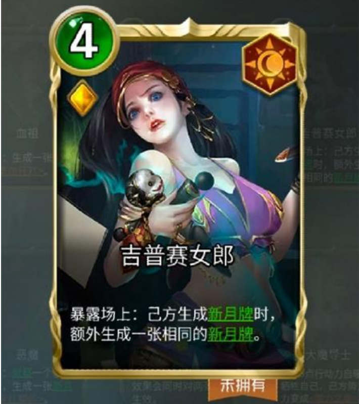 《吉普赛女郎》在卡组里,需要配合其他新月卡的使用,达到1+1的效果。需要提醒大家的是,卡组里不能有太多的新月卡,不然容易卡牌,本身新月卡在晚上的时候用,就是随机在两张新月卡里选择一张出牌,所以玩吉普赛女郎的体系就要注意新月卡适量。