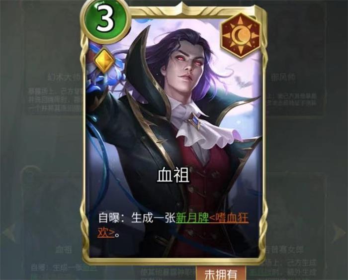 血祖是一张传说神牌,技能为:自爆后也就是翻牌后,生成一张新月牌嗜血狂欢,新月牌可以再夜晚使用。夜晚使用嗜血狂欢后将从我方牌库中抽取所有的狼人牌,然后使这些狼人牌获得契约值加二,也就是血量加二。