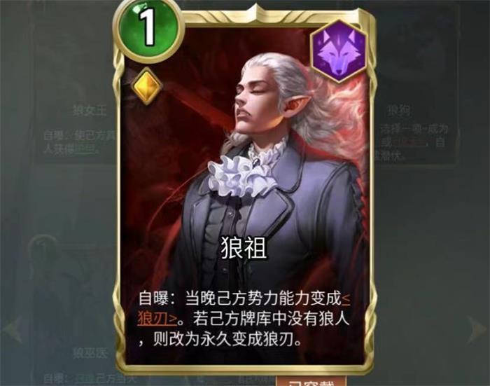 狼祖是一张传说狼牌,狼祖的技能为:自爆后也就是翻卡后,使夜晚的己方技能变为狼刃,狼刃可以消灭敌方任意一个契灵。若我方卡牌库中没有狼牌了则技能永久变为狼刃。