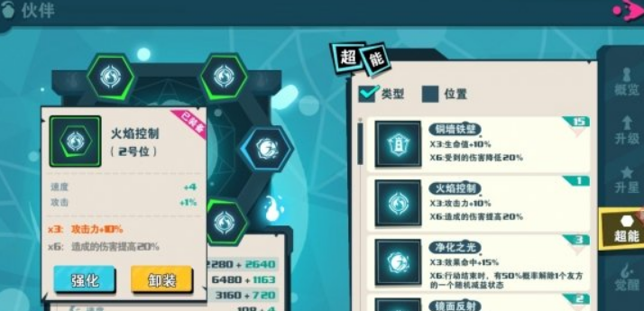 根据伙伴技能——这儿无妨用高攻的暗田举例,她本来总有千伤爆伤力量,再加配超能的话,会另外增幅伤力特效,比方说为暗田加配火焰超能,能让伤害值冲破伤力限制,十分值得。