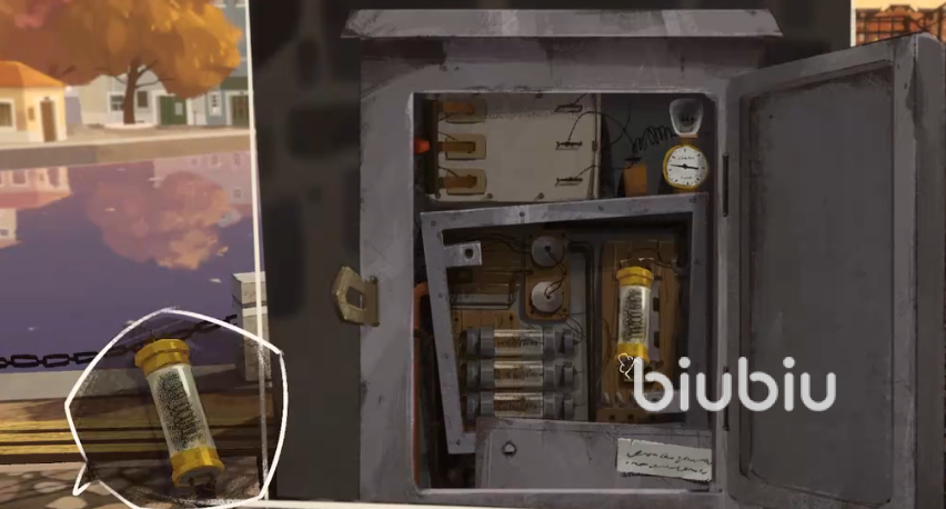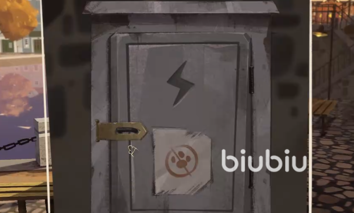 点击锁后再点击一下门就能打开电表箱,将其打开后先点击上面的红色按钮,把电给断掉,然后点击下图中的这个保险丝,将其取下来,前往面包店的后巷,在这里打开面包店的电箱。