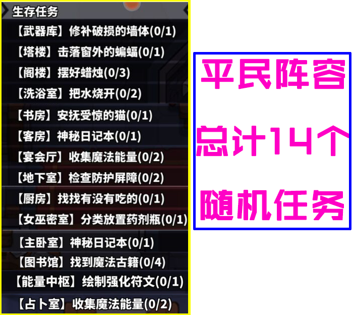 狼人之间游戏中平民阵容一共拥有14个任务,每个任务的地点都不一样,完成的方法也是各有特色,不过难度都不大,所有平民把任务完成即可获得胜利。下面是小编整理出来的任务统计,每个任务的名字以及地点。