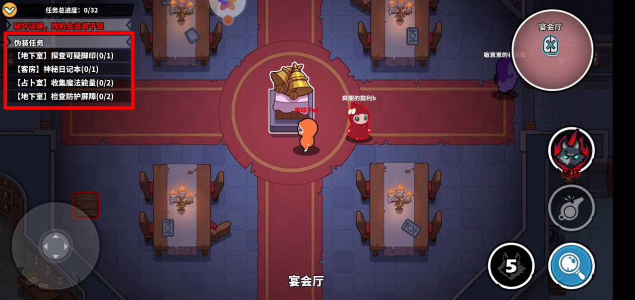 答案是不能!但是狼人拥有自己的伪装任务,毕竟是悬疑游戏,狼人肯定也要有着和平民相同的身份,假装自己也是个平民,这就有了伪装任务的存在,伪装任务跟平民玩家是一样的机制,在十几个任务中随机出来四个。