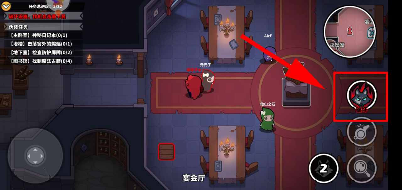 点击右上角小地图,打开大地图,四个破坏选项应对四个平民的紧急任务。任务发生地点分别是女巫密室,占卜室,地下室,书房。记好四个任务的位置,可以更方便对平民下手,列如杀掉地图左边的落单贫民,马上点击地图右边的破坏设施,让大家赶过去,这样就不会被怀疑了。