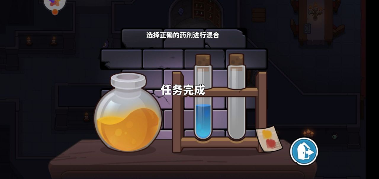 其实药水任务完成的方法更加简单,但是刚玩这个游戏的小伙伴不一定看的懂,只需要动一动手指就能够完成了,如图所示,右下角是任务提示,两种颜色,最左边这个大药品的颜色不管在什么时候都是不会变的,一直是红色。然后提示也只有两种随机变化,一种黄加红,一种蓝加红,非常容易分辨,如果是蓝加红,点一下蓝色药水,如果是黄色,点一下黄色药水,就能够完成任务了。