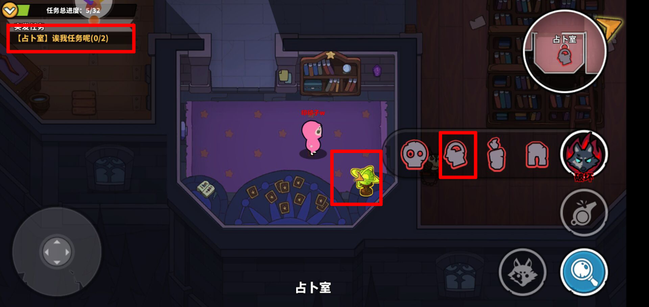 占卜室任务的名字叫做诶我任务呢,小编也不知道为什么会取这么怪异的名字,任务的地点在地图下方的占卜室,完成任务的条件是把占卜求逆向反转,需要一直按住不放,小编感觉这个任务的用处不是很大。