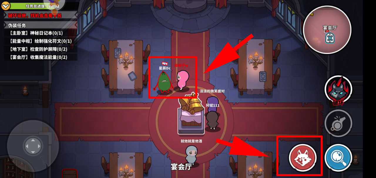 爪子是狼人获胜的关键,因为想要获得胜利,是把平民消灭掉,一直到和狼人平等的数量位置,如图所示,站在平民旁边,右下角的爪子技能就会亮,按一下就能把平民刀掉。目前比较常见的方式有在隐秘的地方刀落单的平民,清洗嫌疑。还有一种就是一大堆人重叠起来做紧急任务直接面刀,这样别人会分不清是谁刀的,非常的给力。