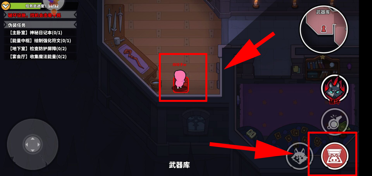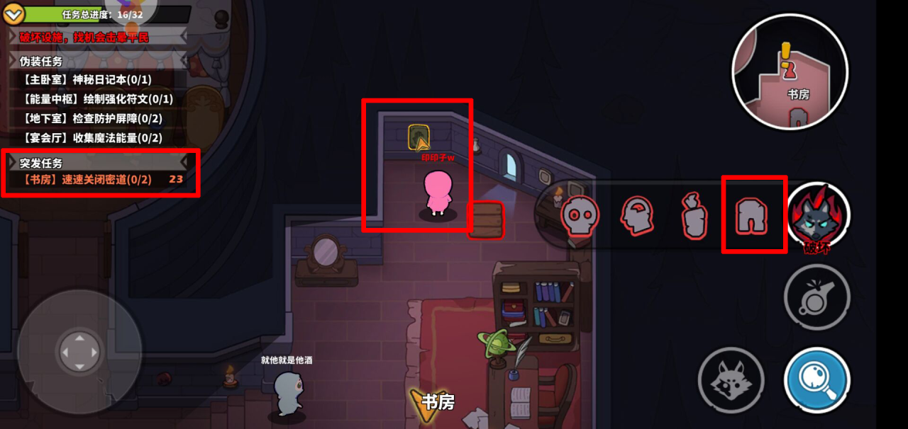 值得一提的就是书房任务了,书房任务的名字叫做速速关闭通道,作用非常大。任务的位置在地图的最右边,非常靠近地图边缘,完成任务的条件是需要同时按住上面和下面的两个按钮,如图所示,在上方有一个按钮,下方还有一个按钮,也就是说,需要两个人才能完成这个任务。有于任务地点比较偏远的缘故,非常适合用来吸引平民位置。例如,在左边打死一个平民之后,立马发布书房任务,让所有人都赶往地图右边,同时自己也加速往那边跑,然后远离死人的地点,等到别人发现为止,这样能够消除平民对自己的嫌疑,所以说帮助非常的大。