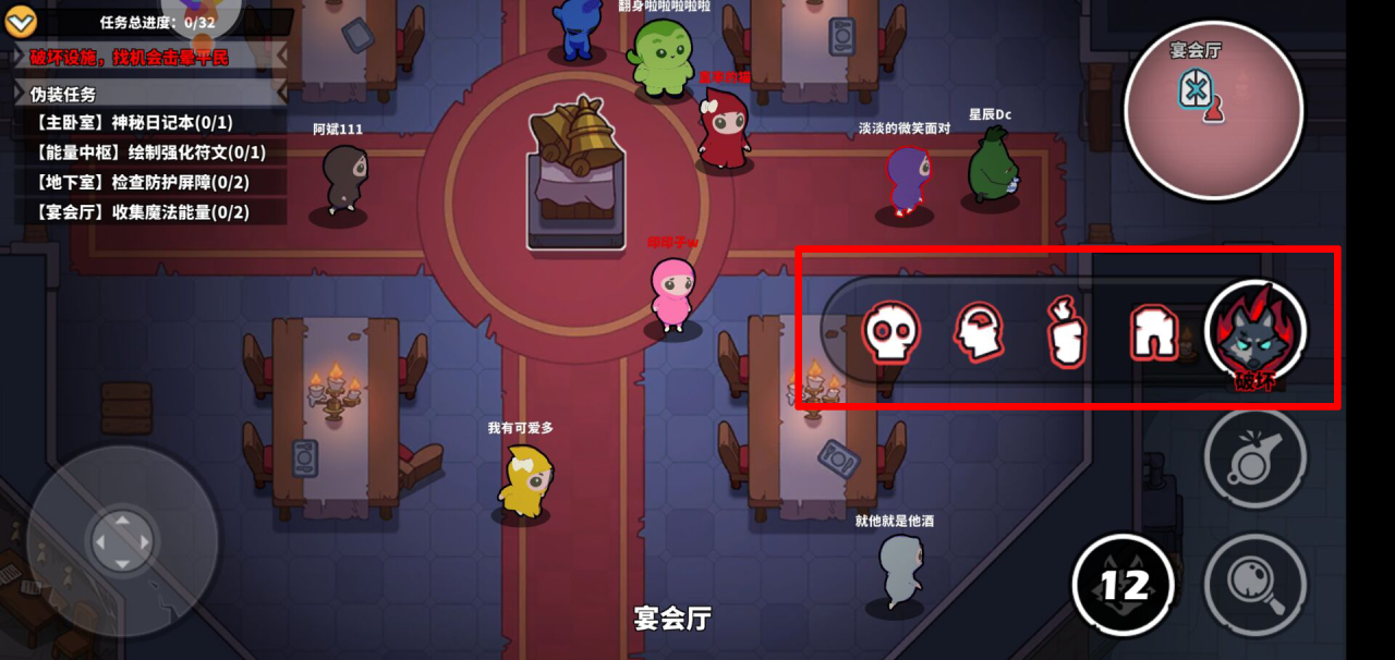 狼人的技能说的就是狼人的一些独有操作,毕竟身为反派阵容,人数也不占优势,狼人肯定是拥有多种手段的,首先来介绍的就是狼人的技能之一,破坏设施,一共有四个技能按钮,能够破坏不同的设施,触发紧急任务,如果平民没有完成任务的话,会让游戏直接结束!