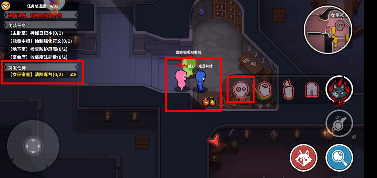 除了发布紧急任务之外,狼人独有的技能还有钻地道,身为狼人,在路途中看到的所有井盖都是红色的,也就是证明自己可以钻进去,钻地道的方法也非常简单,走到地道上面,点击钻地道的技能,如图所示。另外钻入地道之后,还能在地道内进行位移,可以瞬移到地图内各个区域,然后再从区域中的井盖钻出来,一般用于作案后钻井盖逃跑,洗清嫌疑。