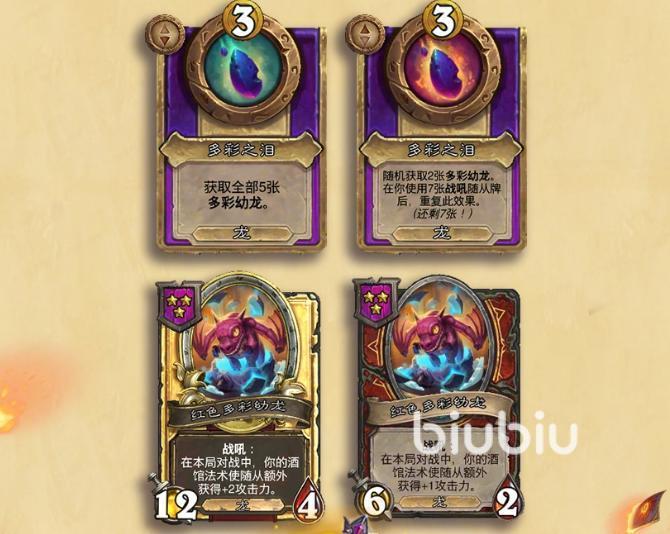 还有就是龙族加入了多彩幼龙机制,有点类似于目前版本的扩音机,一共有5种多彩幼龙,分别可以增加法强、攻血、龙族攻血以及随机获得消耗2铸币的酒馆法术,也有不少相关的配合饰品,例如多彩之泪。