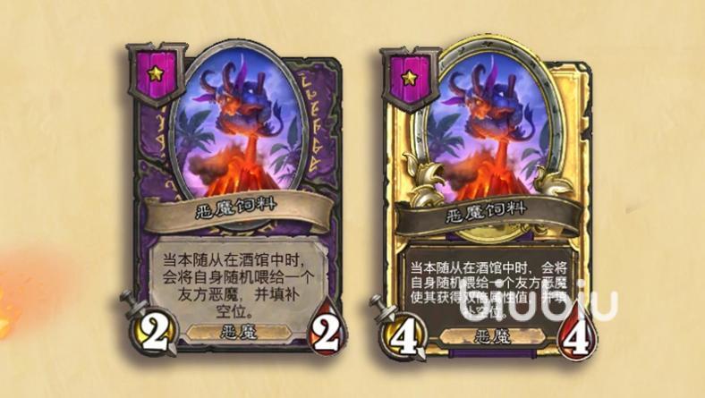 然后是恶魔加入了新机制“恶魔饲料”,一种刷新在酒馆中就会立刻吞噬的机制,通过各种新恶魔随从添加饲料,例如二本“恶魔实验助理”,效果是战吼,在下3次刷新中各添加一个恶魔饲料。此外还可以配合饰品,例如亵渎者肖像来做大饲料的身材。