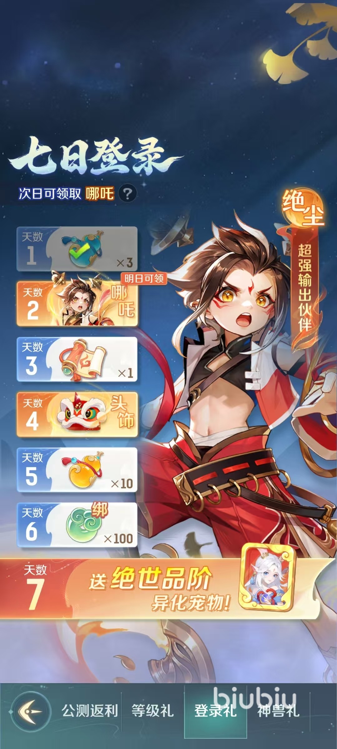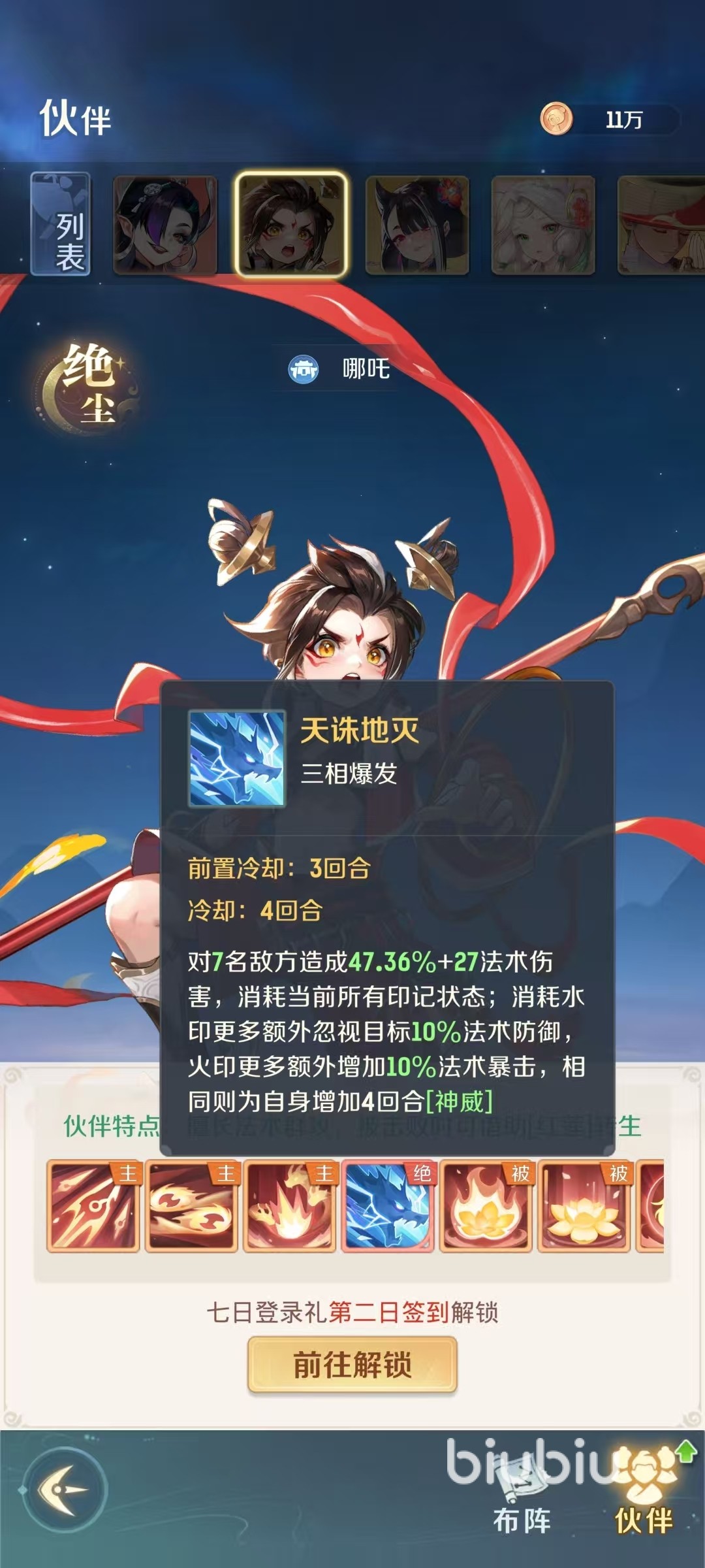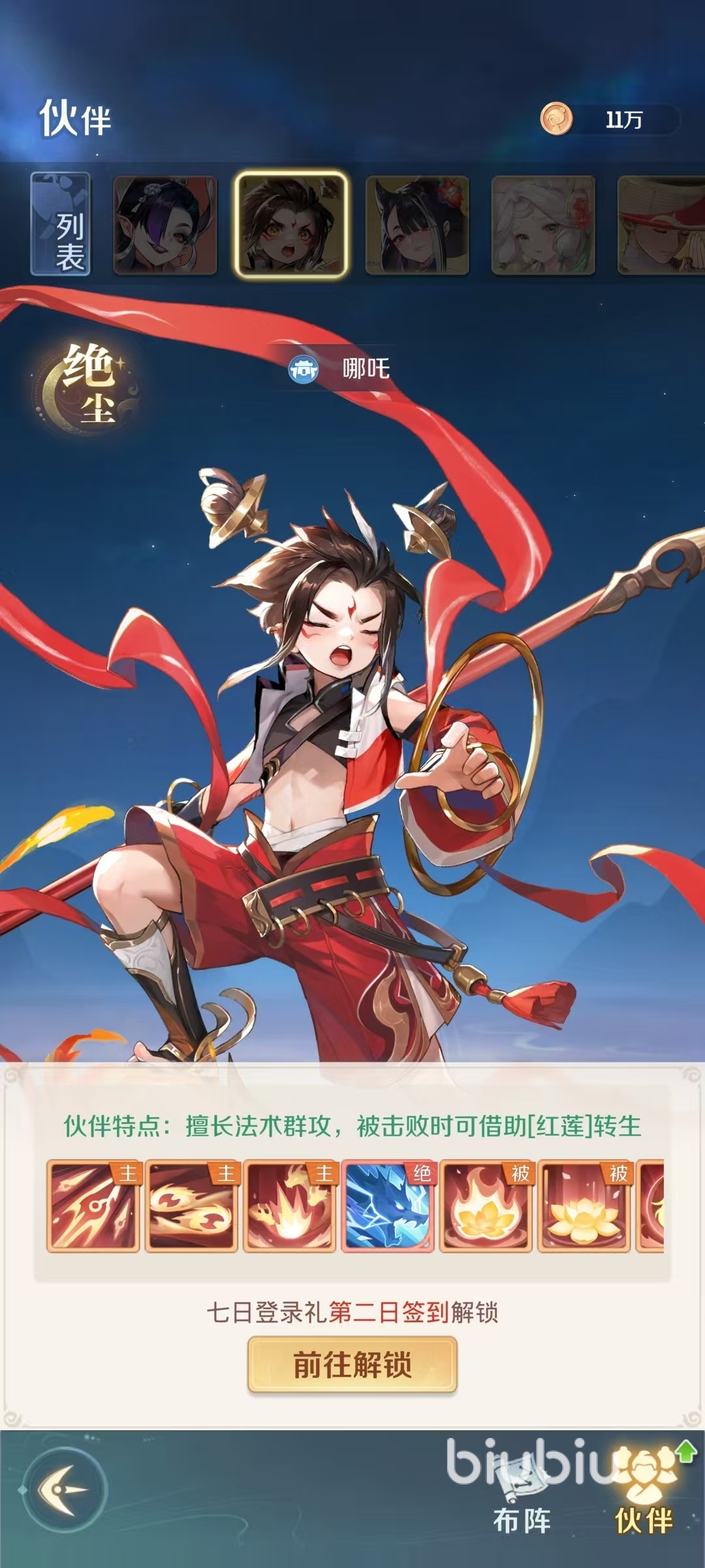 哪咤的获取比较简单,大家只要登录服务器,然后在第2天去7日登录里活动签到,就可以直接解锁了。哪咤是属于绝尘品质的伙伴,虽然比化神要低一些,但依然是前期大家战斗的好帮手。哪咤擅长法术群攻,当被击败时还可以借助红莲转生,这是自身非常有特点的地方。