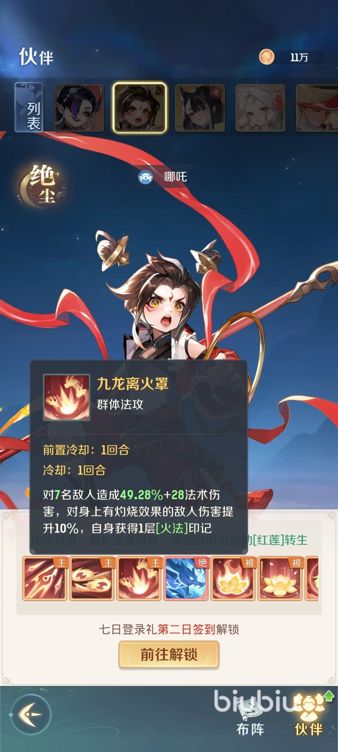 主动技能火尖枪,对竖列的敌人造成法术伤害,自身获得一层火法印记。主动技能风火轮,对横排敌人造成法术伤害,自身获得一层火法印记,这样横排竖排都有了足够的伤害输出。主动技能九龙离火罩,对7名敌人造成法术伤害,对身上带有灼烧效果的敌人,有额外的伤害加成,自身获得一层火法印记。该技能需要前置冷却一回合,使用之后冷却一回合。