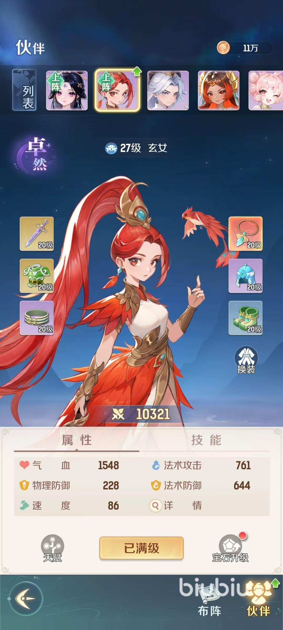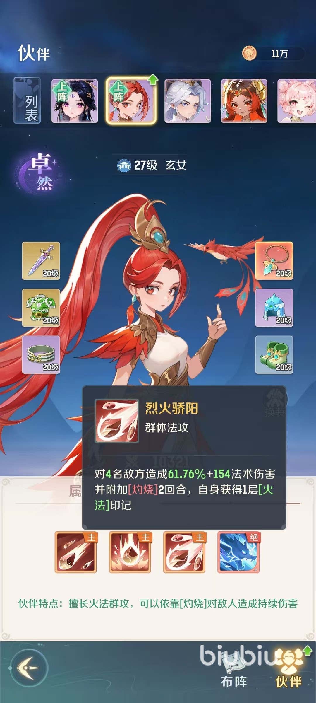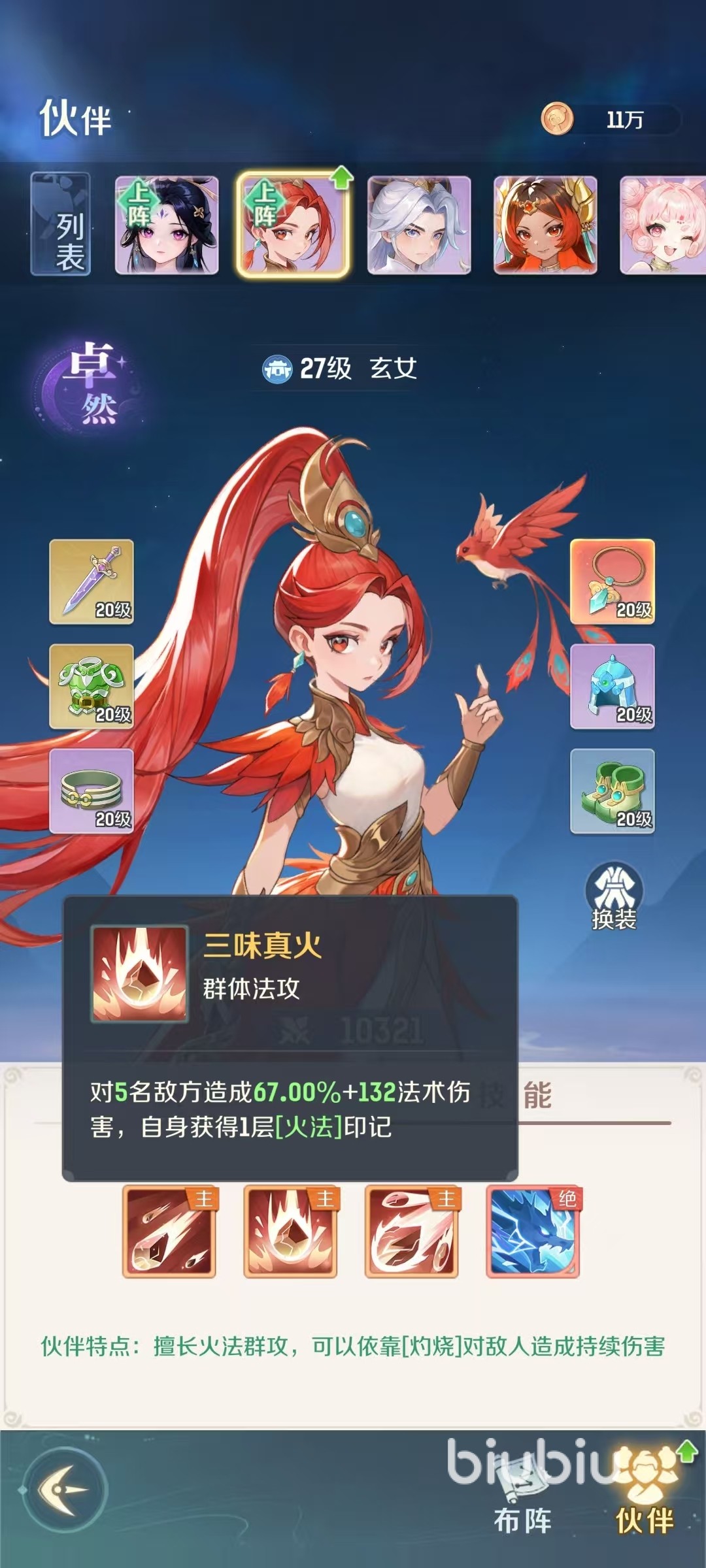 玄女是属于魔法群攻类型的伙伴,可以依靠灼烧对敌人造成持续伤害。主动技能天雷怒火,对3名敌人造成法术伤害,自身获得一层火法印记。主动技能三味真火,对5名敌人造成法术,伤害自身获得一层火印记。主动技能烈火骄阳,对4名敌人造成法术伤害,并附加灼烧,持续两回合,自身获得一层火法印记。