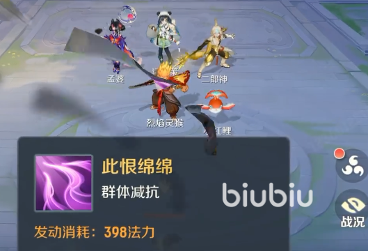 黄金兽的技能会在对敌人造成输出后,有概率让敌人陷入到混乱之中,无法释放技能并且有概率攻击自己的队友,妃子的此狠绵绵会对两位敌人施加3回合异常状态,让敌人对法术的抵抗降低25%,情尽对让一位敌人的法术命中率降低20%,控制抵抗降低20%,谛听能给自己和一个队友附加护盾,进行保护。