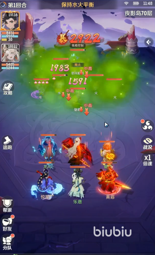 玩法其实也不算复杂,起手利用四面出个将敌方关键目标直接封印,输出治疗角色都可以,之后放出“万毒攻心”将中毒层数叠加;如果敌方有威胁较高敌方单位,”实心狂乱”让敌人行动混乱,将该单位进攻节奏彻底打乱。