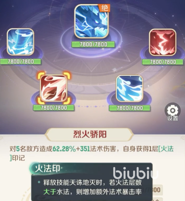 天宫的“叠泉穿心”会对单个敌人造成一定法术伤害,并且让自身获得1层名为水法的印记,他的“烈火骄阳”会对5位敌人造成法术伤害后,让自身得到1层火法,他的“九龙冰封”会对4位敌人造成一定法术伤,该技能对主目标的伤害会额外提升,并让自身得到水法1层。
