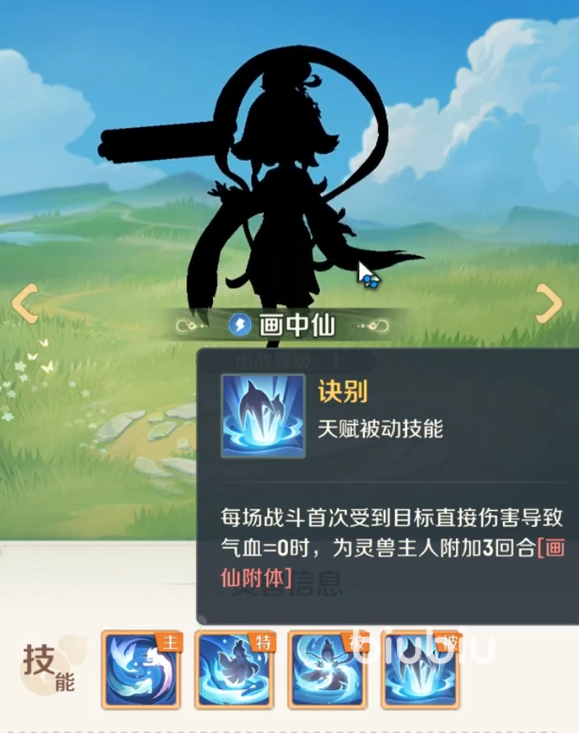 他的“解语”可以给目标附加上三回合画仙附体,并对其进行一个净化,最后为目标队友附加护盾,自身会进入入画3回合,入画能让自己无法被技能给命中,画仙附体会提升携带者15%控制抗性,并提高20%造成的伤害,他的被动能在自己首次气血为0时,给主人附加画仙附体。