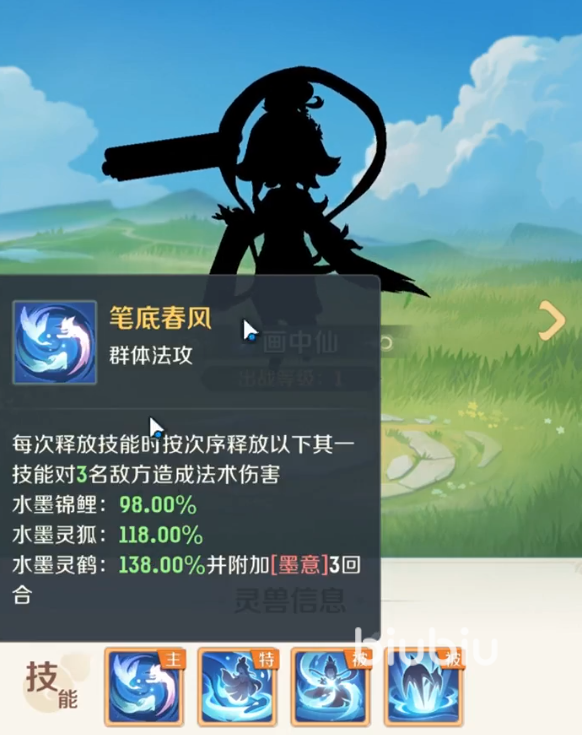 画中仙是一个群体法攻,并且带有一定辅助功能的,他的“笔底春风”能在每一次使用后按照顺序放出水墨宠,水墨锦鲤会造成98%法伤,水墨灵狐会造成118%法伤,水墨灵鹤会造成138%法术伤害,并且还会附加3回合墨意;