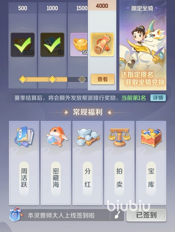 该玩法由一些重点的方面构成,周活跃、拍卖、密藏海分红、宝库、帮派镇兽、帮派迷阵、以及每日任务。帮派组织会设置有1个帮主,2个副帮主,3个长老,4个护法,6洛神,6精英,帮派的组织架构还是非常清晰明确的。