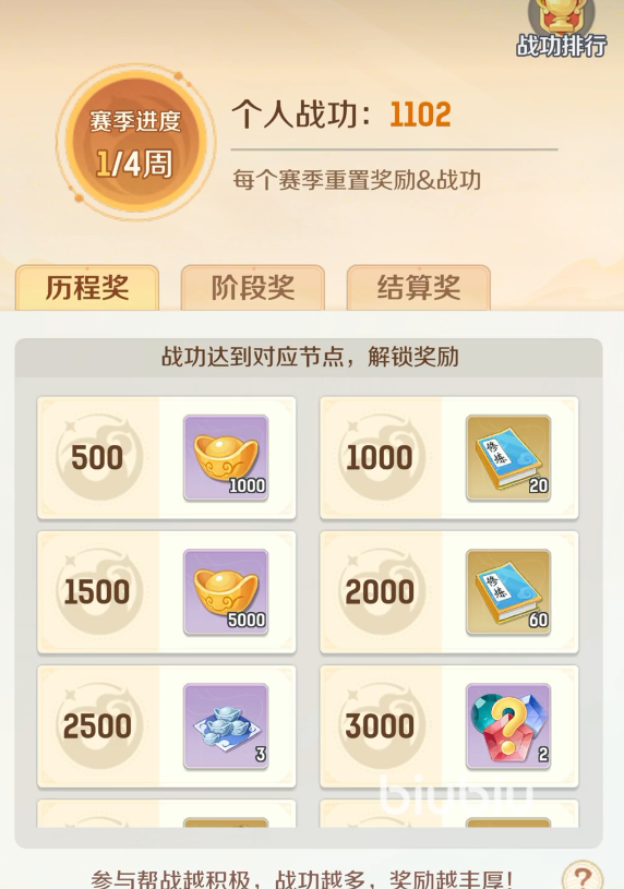 帮派一个月为一次帮派赛季,帮主可以自由分配战利品。帮派威望值比较重要,跟活跃帮战胜负参与人数相关,整个赛季会分为三种奖励,结算奖,阶段奖,历程奖,结算奖排名靠前获得的道具比较丰富;战功排行前100有神兽石头奖励。