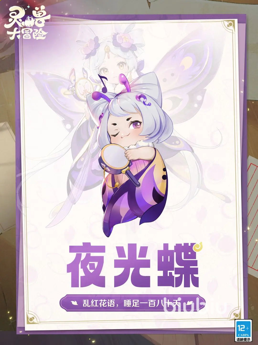 可爱的小蝴蝶一枚,同时也是控制位置的实习生。技能1“迷蝶挚尾”,对2名敌方造成108%法术伤害。招式2“乱红花语”,对1名敌方造成71%法术伤害,并有55%基础概率使目标陷入“混乱”,CD1轮,混乱状态下,只能强制普攻,也有部分几率会攻击队友。技能3“缚茧”,若2技能击中,临时提高自身8%封印命中,有3轮效果。技能4“成蝶”,气血降低至0点时有30%概率重生,回复30%气血,并进入“化蛹”3回合,化蛹时无法进行任何操作。