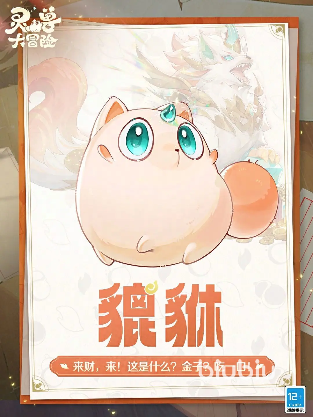 貔貅像一只可爱的小馒头,整体形象非常的萌,大大的眼睛像翡翠一般净透,拥有500年的吃货经验,同时也是金银财宝的品鉴家,在物理输出能力方面也十分的资深。技能1让3名敌方目标受到110%物理伤害,其中的主要目标承受的伤害系数会多18%。技能2攻击后,让单个敌人受到184%物理伤害,有15%概率提高至284%伤害率,并给自己添加3回合“金化”,让它受到伤害降低20%,需2回合CD。3技能在获得金化时,能恢复它20%气血。技能4使用,若是处于金化状态中造成击杀,就可延长一回合该状态。