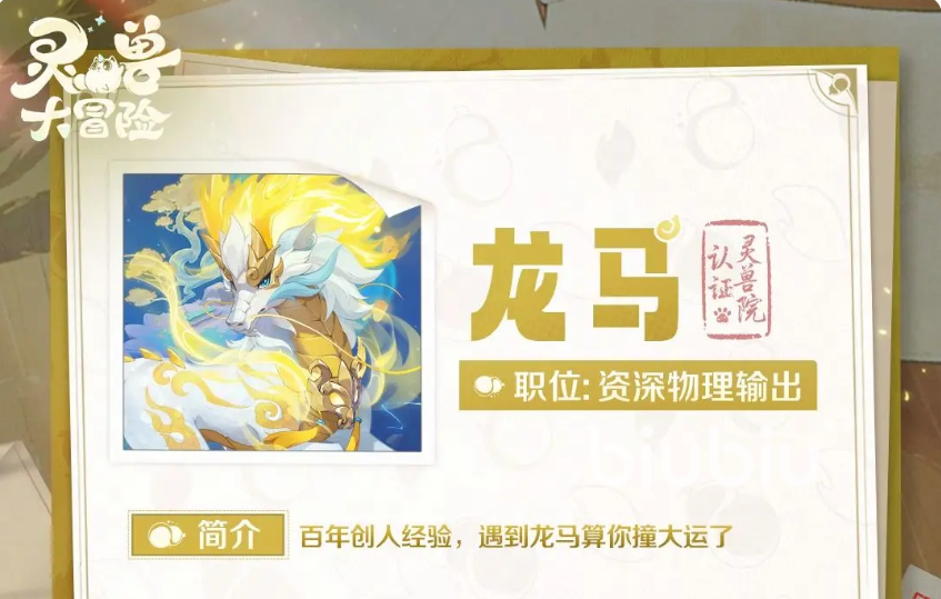 龙马是一只外形看起来和马相似,黄白相间,十分的帅气的灵兽,它的定位是资深物理输出,输出能力非常强悍,同时技能招式也比较多样。1技能可临时提高它10%的攻击力,对敌方单体打出158%物理伤害。2技能使1名敌方单位受到182%物伤,并有60%的几率以该技能额外追击敌方目标,若击败对手,则一定展开追击,这个招式需要2回合进行冷却。