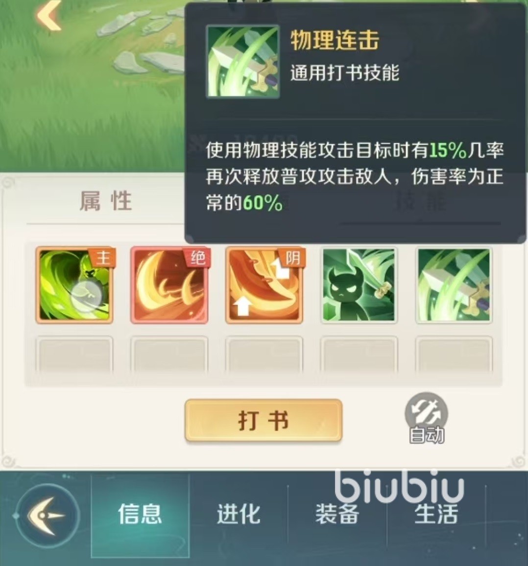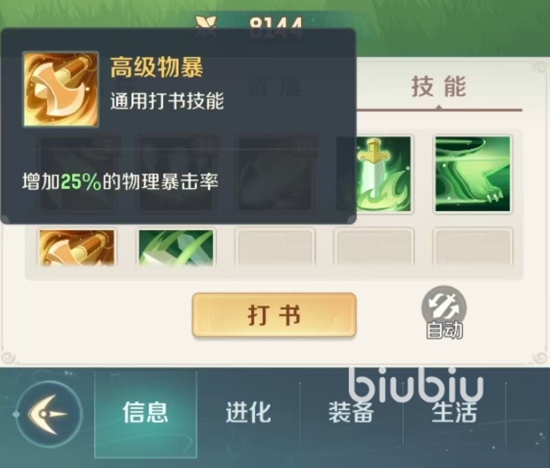 打书的时候,技能选择也要突出上面所说的这些重点,以下是必须要打的技能。第1个是高级物暴,提供25%的物理暴击几率,配合孙悟空的法天象地,能够打出恐怖伤害。第2个分花拂柳,是补充伤害的重要手段,配合上孙悟空的高额输出,前期绝大多数宝宝吃一个技能加上连杀会直接飞掉。第3个高级汲取,属于续航生存类技能,配合法天象地的暴击,可轻松回血。第4个高级神工,孙悟空本身技能倍率加成很高,拥有足够的面板攻击力,加上高级神工,能够将技能伤害最大化的转化出来。