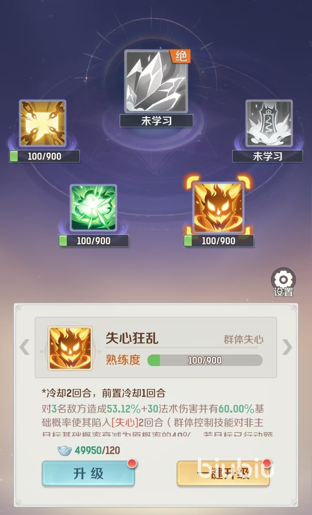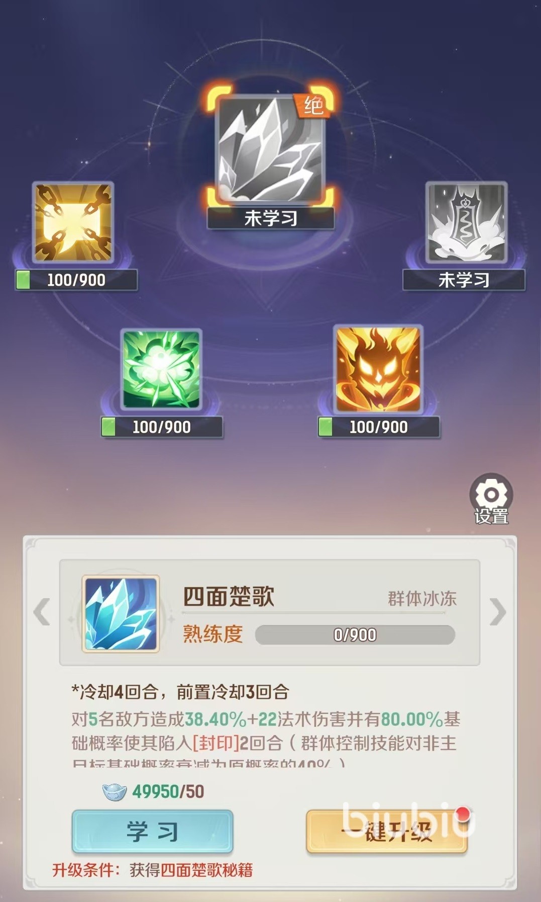 三技能为群体封印类型,可最多攻击三个目标,有60%的基础几率使得目标被失心,持续两个回合,需要一回合的前置冷却,使用之后冷却二回合。对于非主目标的成功率会下降到24%。对方被失心之后无法使用门派技能,药品和召唤宠物。第四个技能对敌方一个目标造成伤害,额外附加三个回合的重伤效果,并且将对方身上的中毒状态直接进行结算,使用后冷却两个回合。绝技可对5个敌方目标造成伤害,有几率使得目标被封印。