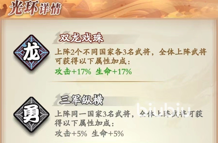 在布阵的时候一定要考虑到光环效果,目前最为出色的就是双龙戏珠,五虎争霸三足鼎立和六合天下。其中六合天下最为强势,但是需要上阵同一国家6名武将,这样不利于后期培养,也会造成浪费。所以小编最推荐的就是双龙戏珠,两个不同国家各自出战三名武将,属性加成不低,培养起来更简单。