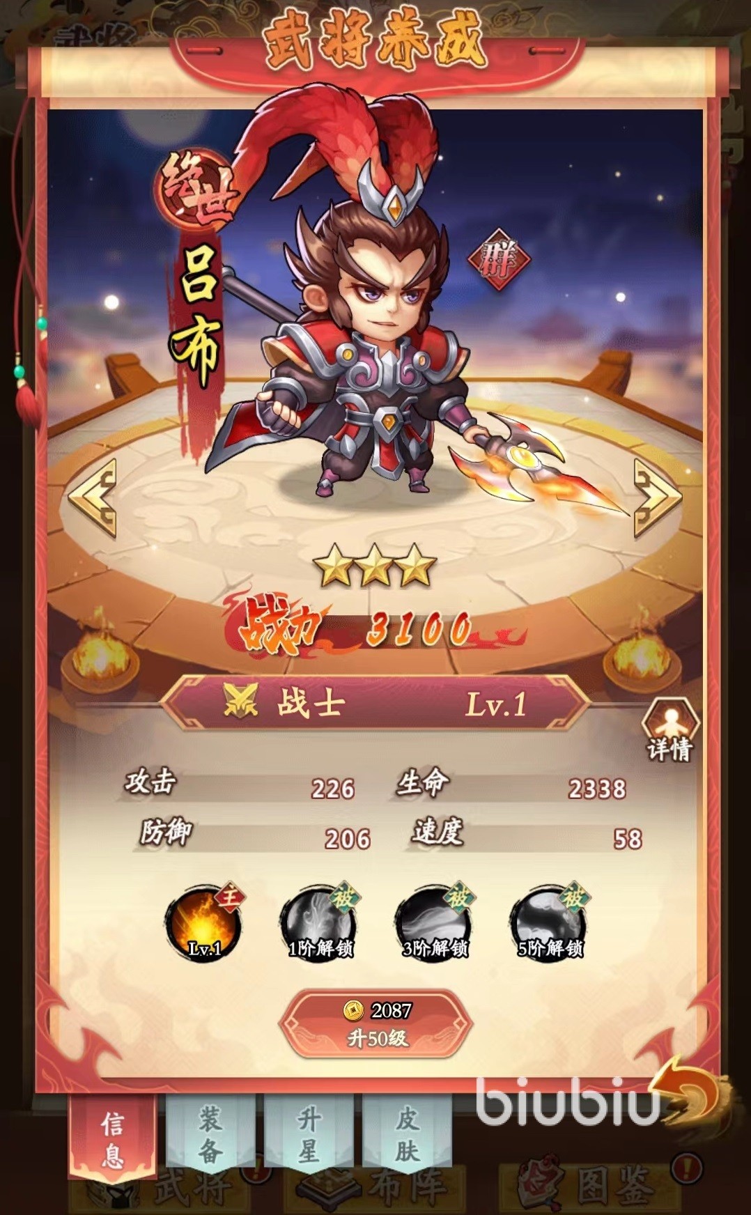 具体角色搭配方面,小编推荐一套阵容就是群雄吕布,华佗与貂蝉,以及蜀国黄月英,诸葛亮和关羽,这6个人都是红色品质,个体实力非常出色。尤其是吕布,更是前期最为出色输出型选手,攻击伤害高暴击率高,自身血量越低攻击力以及吸血加成也就越出色,是越战越勇型人物。华佗虽然不是单纯治疗,但是对己方的辅助能力也很强,再加上还有主动技能中毒伤害效果。