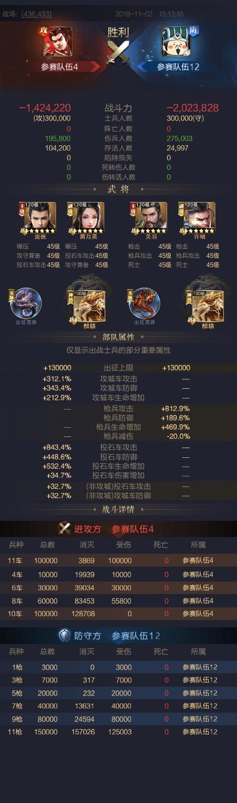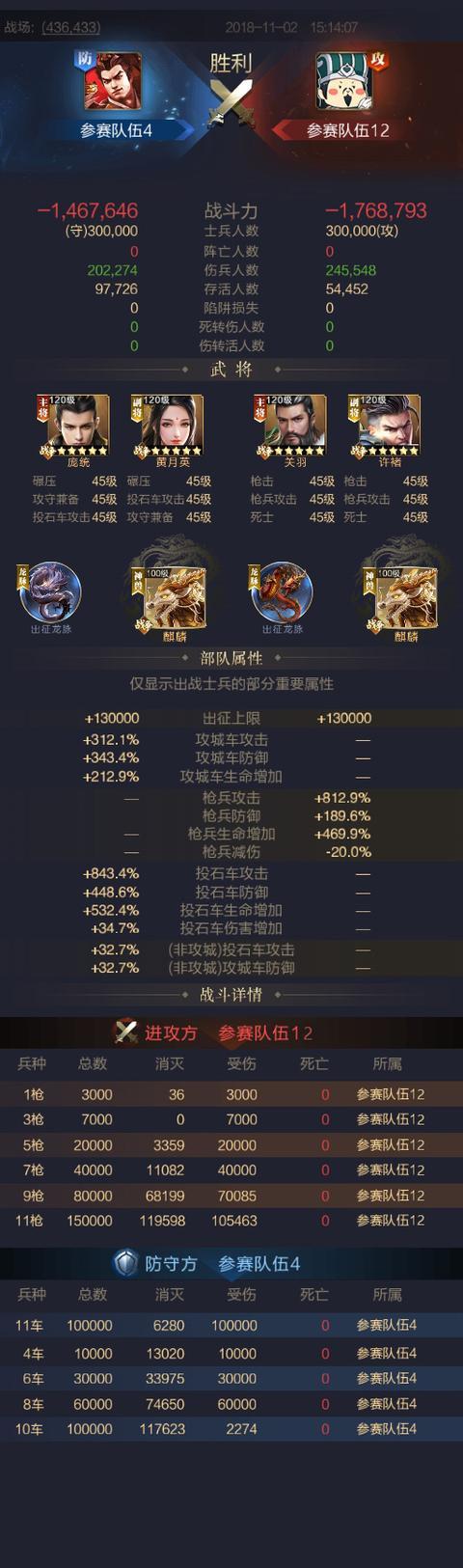 最后,小队12的30W枪兵依赖自身厉害的爆发力和【死士】造成影响加成冲破攻城车,击倒总计20W阁下的车兵,全部摒弃"承受伤害"的装备也让投石车全部搞出了伤害,在这次暴力的对战中几乎全军尽没。