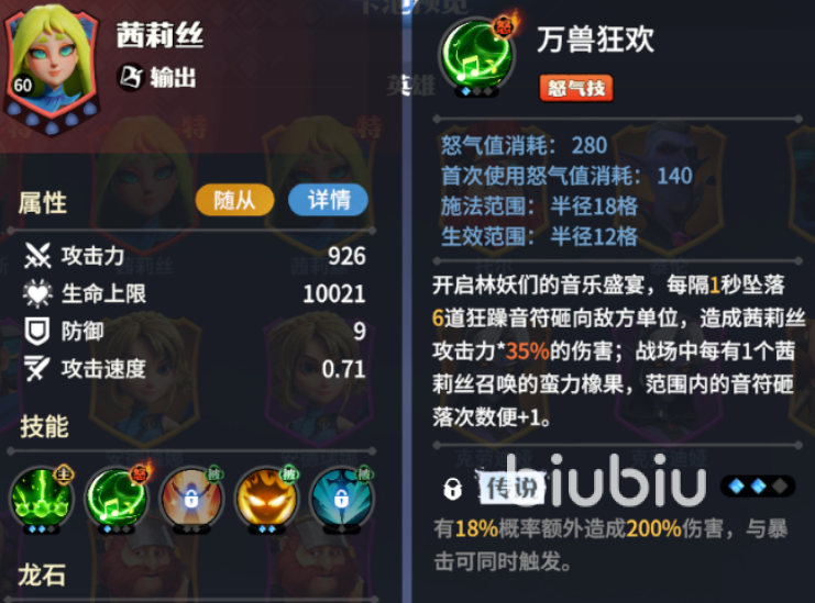 茜莉丝被称为 “万兽之灵”,是常驻卡池中的后排输出角色,擅长召唤生物来一同作战。她的怒气技能很强势,每隔1秒便能坠落6道音符砸向敌人,造成的伤害与自身攻击力挂钩,并且音符的砸落次数还能够增加。能在关键时刻打出高额伤害,是对局中可靠的输出担当。