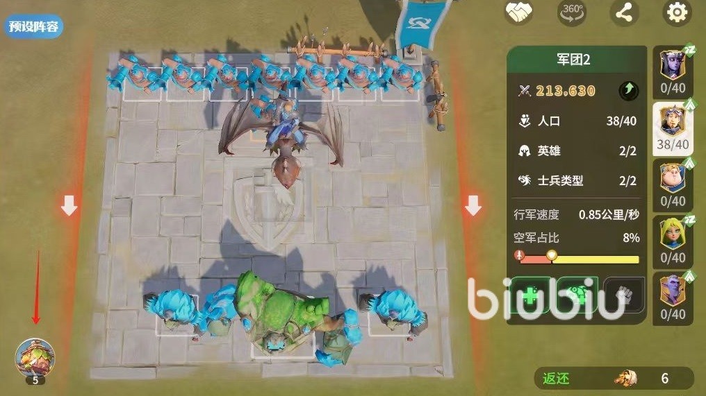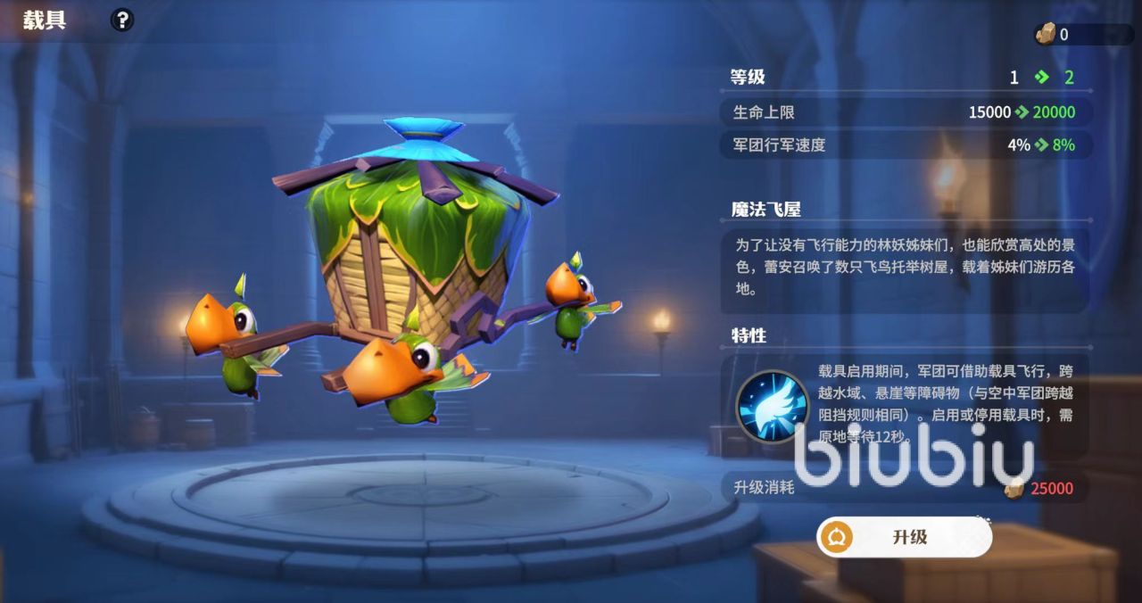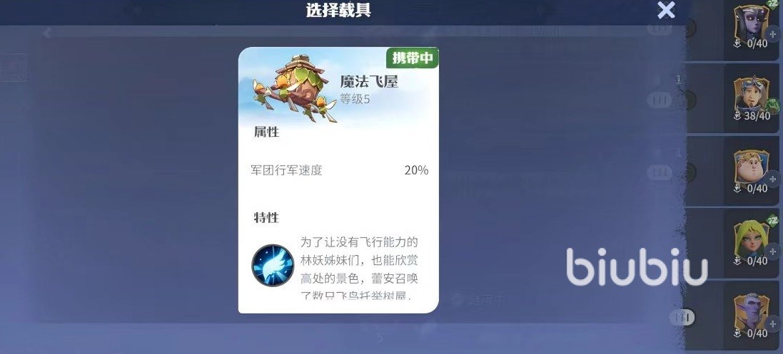 在军团携带完载具后,载具就会出现在军团的后方,这时整个军团可以享受到载具所提供的属性加成。在启用载具特性的持续时间之内,战斗单位会消失,只显示出载具。最后给大家介绍一个目前非常好用的载具魔法飞屋,这是古树新生剧本中可以使用的类型。特性是可以使陆地军团变为纯空军军团,行军时可以跨过一切地面障碍,这样的特性对于战斗有着非常重要的影响。