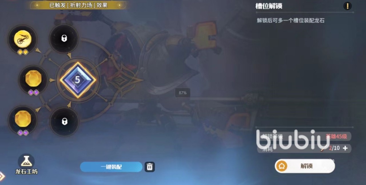 有了龙石之后还需要有相应的槽位,大家可以通过白嫖的方式获得两个免费槽位,分别在15级和25级的时候解锁。接下来就需要进行氪金了,在35级、45级和55级的时候,消耗龙石打孔器,可以解锁额外的槽位。有了槽位之后就可以自由去镶嵌和替换龙石,打孔器是在商店和通行证中获取到的道具。只要玩家装配了龙石之后,就可以立即获得所附加的效果和属性。技能型龙石装配之后,其他槽位只能装同名或者是万用龙石。装配的同名龙石数量越多,生效的效果也就越强。