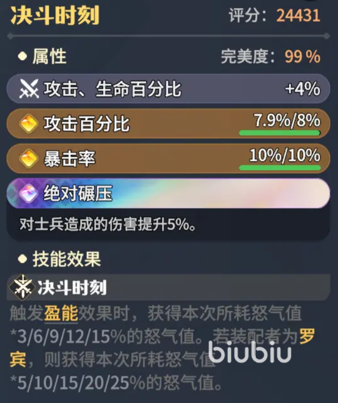 决斗时刻:战斗中触发盈能效果获取怒气;战意激增:提升怒气恢复速度;残暴之力:增强范围伤害输出;洗炼属性建议:攻击力、回怒加成、暴击率。怒气值决定了罗宾技能的释放频率,因此优先提升回怒效率至关重要。