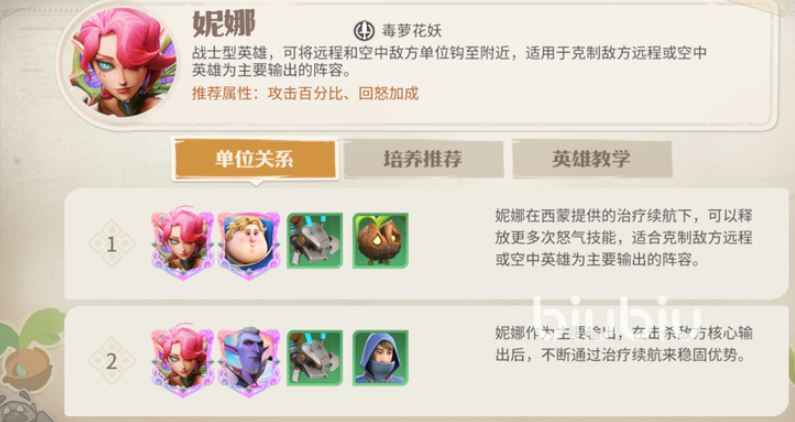 妮娜的定位是战士型,它的被动技会在每次使用完“追猎毒花”后,让下一次的普攻能降低目标的防御值,并提升自己的,此时的普攻还会形成额外伤害,英雄品阶突破到史诗能额外获取目标的攻击力,她的怒气技“追猎毒花”会用毒花把敌人拉到自己的面前并形成输出值,此招会优先对最远的空中目标使用,被捕捉到的空敌还会在掉落地面后,进入持续4秒钟的束缚状态。