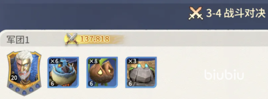 这关可以看到敌人的首领是一位飞行角色,怪物阶数不是很高,有6个素火龙、3个刚毅石头人和8个巨力橡果,由于飞行物会比较多,所以这关推荐优先用能克制他们的轰天大兵来打,橡果可以靠着钻探工来克制,人数最少的石头人不用管他就能直接通关。
