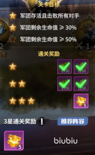 在进入战斗前,可以在战前准备页面得到不少对战斗有用的信息,上方的战力能判断出自己是否需要提升,左下角的敌情能查看关卡敌方的兵种和英雄,从而针对敌方的弱点,调整自己的关卡阵容来通关,若敌方输出英雄搭配上大量的后排兵,且关卡的三星条件对我方血量又一定要求,那么正面硬刚就很难维持我们的血线,很容易因为前排抗伤过多导致血量不达标,此时建议英雄用召唤类的,用他们的召唤物来抵抗伤害,降低队伍正面遭受的伤害,再加入切入型的刺客角色,来优先解决掉后排输出,就能顺利过关。