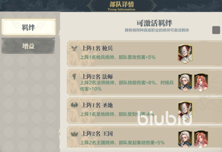 使用该阵容之后,就能够获得四个阵营的羁绊。一枪兵则可增加普通输出,三法师则可触发二法师羁绊,增加所有人的技能伤害,并对骑兵的伤害更高。还可触发一圣地的羁绊,减少部队所受到的伤害。另外还可触发双王国的羁绊,可以增加部队集结伤害。