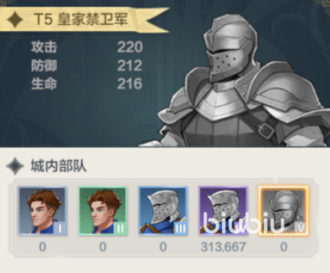 除了队伍能决定你的战力之外,更重要的就是兵种属性、数量以及等级。想要提升兵种等级的话需要升级城堡,然后便可解锁更高等级的兵营。一般来说,皇家禁卫军的属性最好,但是所需资源也最多。所以平民玩家们不要好高骛远,前期最好升级大量的T1级别士兵,即可满足日常采集的需要。这样就能轻松度过开荒期,可用最少的时间获得最多的资源。