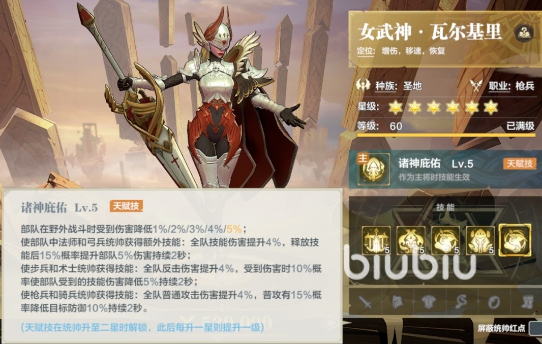这里以瓦尔基里举例,作为典型的全能型统帅代表,在她的领导下,各类不同的兵种都能得到额外的提升,同时她自身的圣地和枪兵属性也能独立激活,在组建队伍时,大家去结合不同专业技能的副将,更是能进一步增强整个队伍的技能效果。