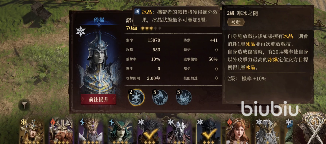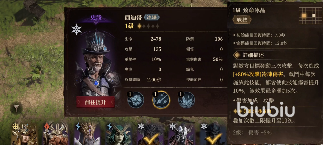 西迪哥:作为紫色稀有英雄,西迪哥在冰爆阵容中非常有价值。他的技能有50%的几率无视敌人30%的防御,适合用来对付盾厚的敌人。西迪哥施放战技后,如果拥有冰晶,会消耗1层冰晶并再次施放战技,增加伤害输出。