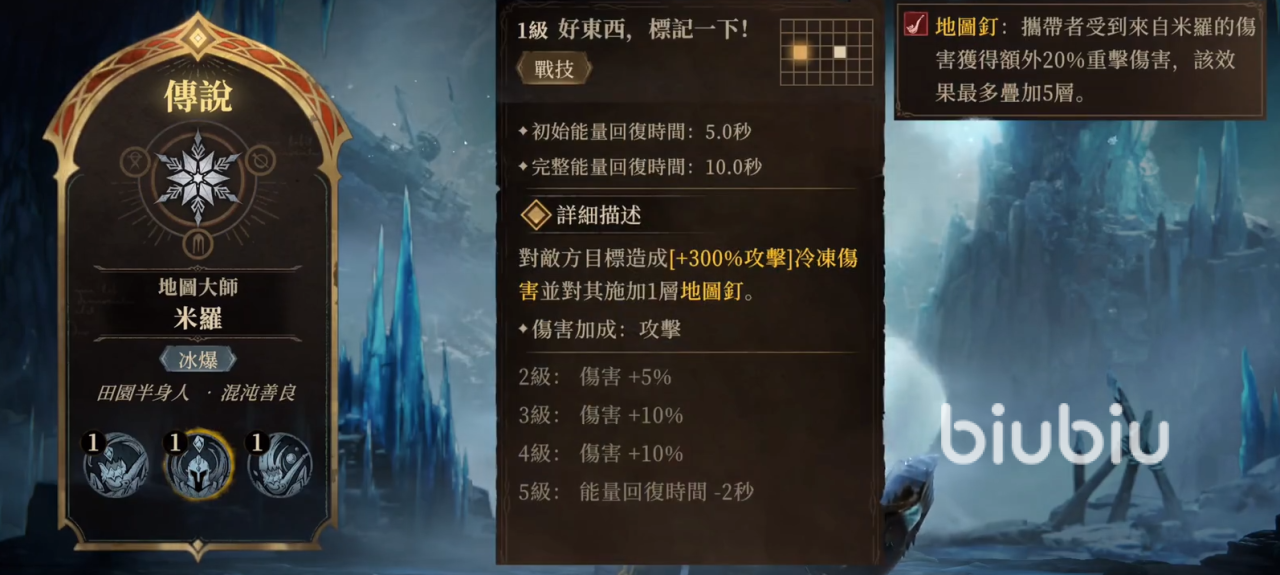 对敌方目标造成[+300%攻击]冷冻伤害,并施加1层“地图钉”。“地图钉”会使敌人受到来自米罗的伤害时,增加20%的重击伤害,最多叠加5层。