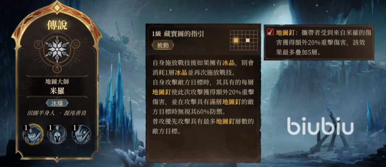 施放战技后,如果米罗拥有冰晶,则消耗1层冰晶并再次施放战技。攻击时,每有1层“地图钉”,此次攻击的重击伤害提高20%。当攻击目标具有满层“地图钉”时,普攻将优先攻击具有最多层数的敌人,并无视60%防御。