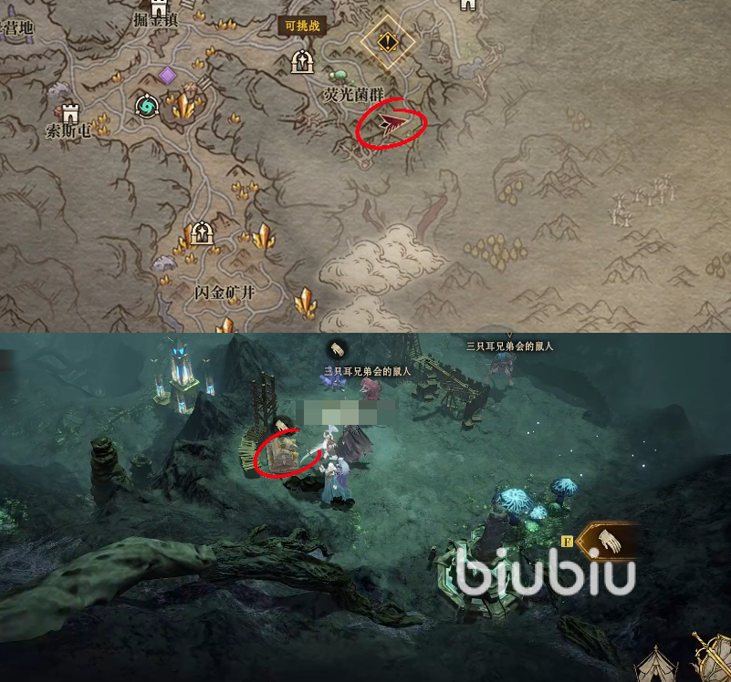 位于荧光菌群的右下角,三只耳兄弟会老熟人的左下角木制脚手架的旁边。