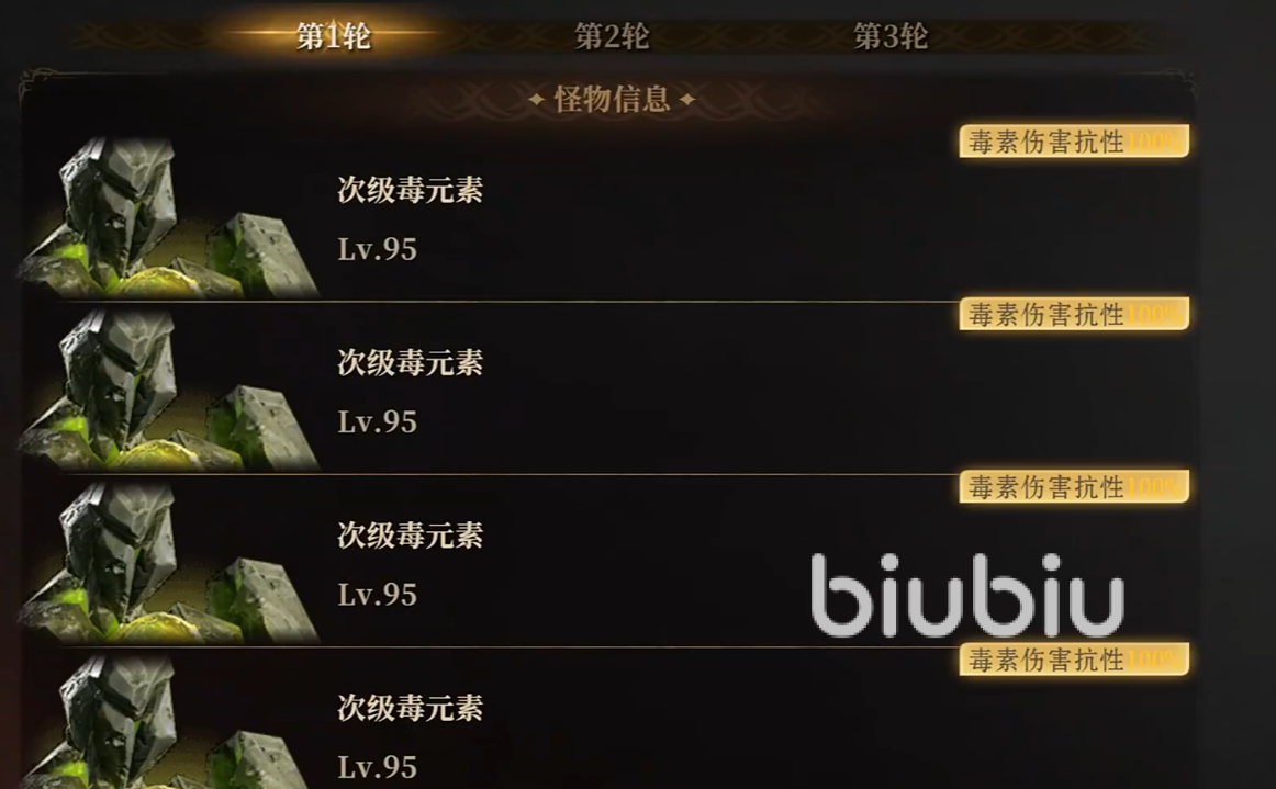 首先到第二张地图,塔防变得难打的原因是因为元素抗性的怪物,大家可以看下图的第一轮全部都是毒素抗性拉满的怪物,这就意味着我们上毒属性英雄打它们,怪物不会受到一点的伤害。